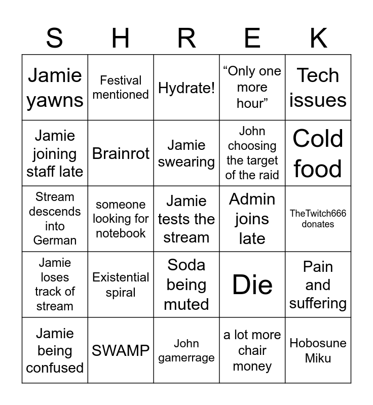 This bingo card has a free space and 24 words: Existential spiral, SWAMP, Jamie swearing, Jamie being confused, Tech issues, Jamie yawns, Jamie joining staff late, Festival mentioned, Admin joins late, Soda being muted, John choosing the target of the raid, Stream descends into German, Die, Pain and suffering, Brainrot, a lot more chair money, TheTwitch666 donates, Hydrate!, Cold food, someone looking for notebook, Hobosune Miku, Jamie loses track of stream, “Only one more hour” and John gamerrage.