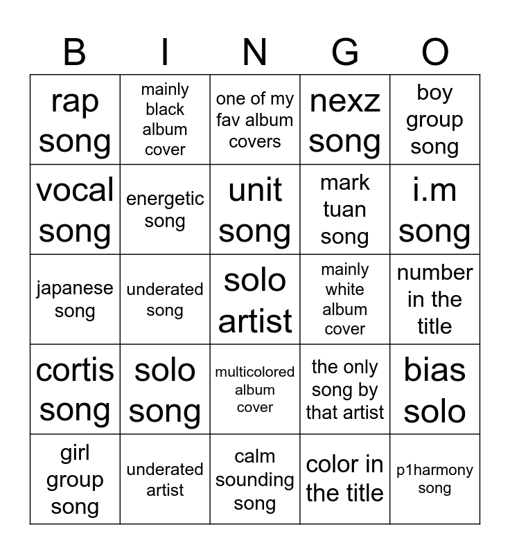 This bingo card has a free space and 24 words: solo song, underated artist, unit song, girl group song, boy group song, rap song, vocal song, mainly black album cover, mainly white album cover, multicolored album cover, mark tuan song, japanese song, the only song by that artist, bias solo, energetic song, color in the title, number in the title, one of my fav album covers, i.m song, underated song, p1harmony song, cortis song, nexz song and calm sounding song.
