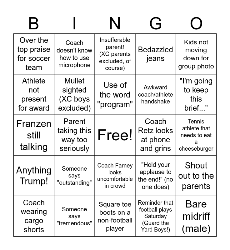 This bingo card has a free space and 24 words: Someone says "outstanding", Someone says "tremendous", Use of the word "program", Coach wearing cargo shorts, Kids not moving down for group photo, Over the top praise for soccer team, Athlete not present for award, Coach doesn't know how to use microphone, Coach Retz looks at phone and grins, Coach Farney looks uncomfortable in crowd, Awkward coach/athlete handshake, Franzen still talking, "Hold your applause to the end!" (no one does), Shout out to the parents, Mullet sighted (XC boys excluded), Reminder that football plays Saturday (Guard the Yard Boys!), Tennis athlete that needs to eat a cheeseburger, Insufferable parent! (XC parents excluded, of course), "I'm going to keep this brief...", Parent taking this way too seriously, Bare midriff (male), Anything Trump!, Bedazzled jeans and Square toe boots on a non-football player.