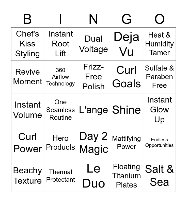 This bingo card has a free space and 34 words: Negative Ion Technology, Floating Titanium Plates, Dry Shampoo, Refresh, Curl Power, 360 Airflow Technology, Heat & Humidity Tamer, Beachy Texture, Instant Root Lift, Tousled Ends, Frizz-Free Polish, Dual Voltage, Curl or Straighten, Kelp & Sea Salt Extracts, Shine, Sulfate & Paraben Free, Thermal Protectant, Instant Volume, Hero Products, Mattifying Power, Day 2 Magic, Better Together, Chef's Kiss Styling, Instant Glow Up, Le Duo, Salt & Sea, Deja Vu, Thermal Magique, Curl Goals, Revive Moment, Four Top Sellers, One Seamless Routine, Endless Opportunities and Lived-in Texture.