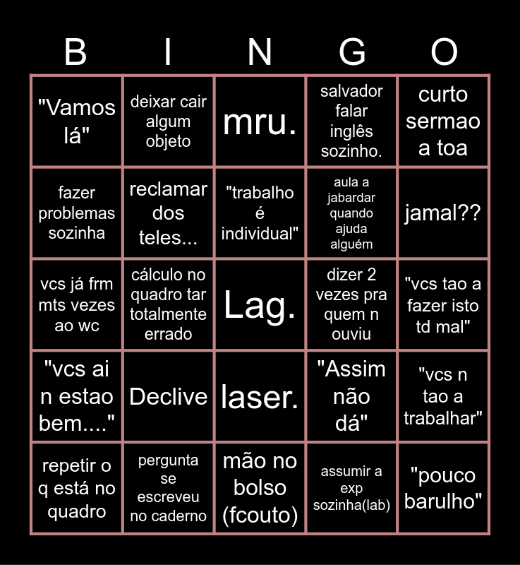 This bingo card has a free space and 24 words: Declive, pergunta se escreveu no caderno, "trabalho é individual", repetir o q está no quadro, curto sermao a toa, "Vamos lá", fazer problemas sozinha, deixar cair algum objeto, dizer 2 vezes pra quem n ouviu, laser., aula a jabardar quando ajuda alguém, vcs já frm mts vezes ao wc, "Assim não dá", "vcs n tao a trabalhar", reclamar dos teles..., assumir a exp sozinha(lab), "vcs tao a fazer isto td mal", mru., jamal??, cálculo no quadro tar totalmente errado, "pouco barulho", "vcs ai n estao bem....", salvador falar inglês sozinho. and mão no bolso (fcouto).