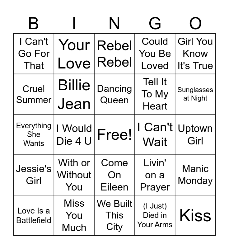 This bingo card has a free space and 35 words: Africa, Any Way You Want It, Back To Life, Billie Jean, Come On Eileen, Could You Be Loved, Cruel Summer, Dancing in the Dark, Dancing Queen, Don't Stop Believing, Everything She Wants, Girl You Know It's True, Gypsy, Hungry Eyes, I Can't Go For That, I Can't Wait, (I Just) Died in Your Arms, I Would Die 4 U, Jessie's Girl, Kiss, Livin' on a Prayer, Love Is a Battlefield, Manic Monday, Miss You Much, Rebel Rebel, Sunglasses at Night, Sweet Child O'Mine, Take Me Home Tonight, Tell It To My Heart, Uptown Girl, Wanna Be Startin' Somethin', We Built This City, With or Without You, Your Love and You Spin Me Right Round (Like a Record).