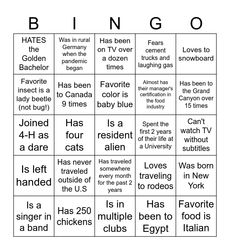 This bingo card has a free space and 24 words: Has never traveled outside of the U.S, Has 250 chickens, Favorite color is baby blue, Is a singer in a band, Loves to snowboard, HATES the Golden Bachelor, Favorite insect is a lady beetle (not bug!), Was in rural Germany when the pandemic began, Spent the first 2 years of their life at a University, Has traveled somewhere every month for the past 2 years, Almost has their manager's certification in the food industry, Joined 4-H as a dare, Loves traveling to rodeos, Was born in New York, Has been to Canada 9 times, Has been to Egypt, Can't watch TV without subtitles, Has been on TV over a dozen times, Has been to the Grand Canyon over 15 times, Has four cats, Favorite food is Italian, Is left handed, Fears cement trucks and laughing gas and Is in multiple clubs.
