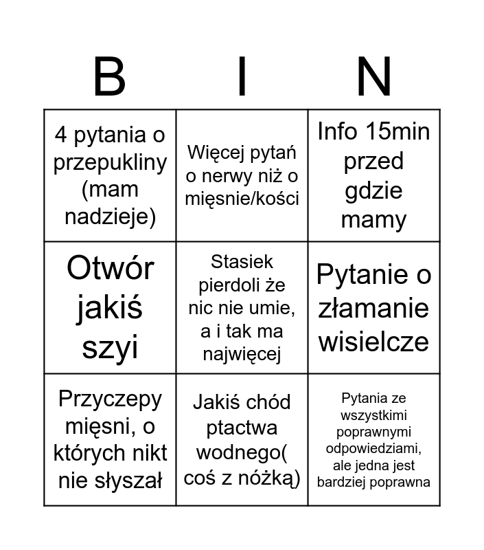 This bingo card has a free space and 8 words: Pytanie o złamanie wisielcze, Info 15min przed gdzie mamy, Więcej pytań o nerwy niż o mięsnie/kości, Przyczepy mięsni, o których nikt nie słyszał, 4 pytania o przepukliny (mam nadzieje), Pytania ze wszystkimi poprawnymi odpowiedziami, ale jedna jest bardziej poprawna, Otwór jakiś szyi and Jakiś chód ptactwa wodnego( coś z nóżką).