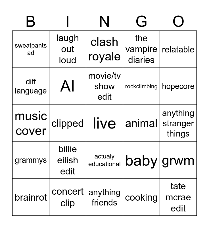 This bingo card has a free space and 24 words: billie eilish edit, concert clip, movie/tv show edit, brainrot, relatable, sweatpants ad, diff language, laugh out loud, animal, actualy educational, rockclimbing, music cover, baby, grwm, AI, cooking, anything stranger things, clash royale, hopecore, clipped, tate mcrae edit, grammys, the vampire diaries and anything friends.