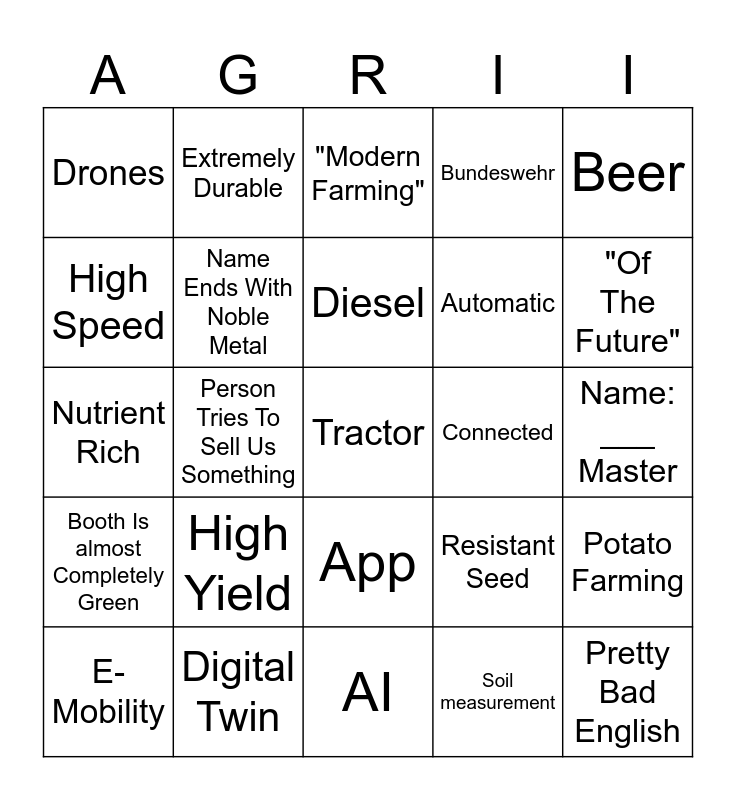 This bingo card has a free space and 24 words: High Yield, Digital Twin, Diesel, E-Mobility, Beer, Drones, High Speed, Extremely Durable, Connected, App, Automatic, Nutrient Rich, Resistant Seed, Potato Farming, Name Ends With Noble Metal, Soil measurement, Name: ___ Master, "Modern Farming", "Of The Future", Person Tries To Sell Us Something, Pretty Bad English, Booth Is almost Completely Green, Bundeswehr and AI.