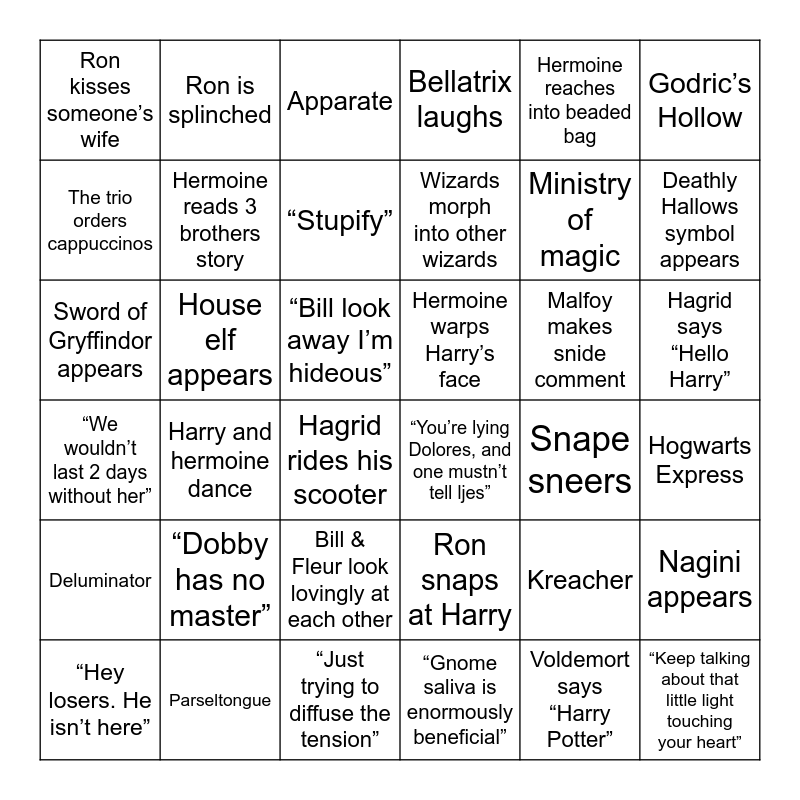 This bingo card has 47 words: Someone says “Dark Lord”, Sword of Gryffindor appears, Horcrux demolished, Snape sneers, Malfoy makes snide comment, Ron snaps at Harry, Ron is splinched, Someone cries(?), Godric’s Hollow, Parseltongue, The trio orders cappuccinos, Bellatrix laughs, Harry and hermoine dance, “We wouldn’t last 2 days without her”, Voldemort says “Harry Potter”, Bill & Fleur look lovingly at each other, Hermoine reads 3 brothers story, House elf appears, “Dobby never meant to kill, just maim or seriously injure”, Hermoine reaches into beaded bag, Deathly Hallows symbol appears, Hogwarts Express, Ron kisses someone’s wife, “Stupify”, “Obliviate”, Wizards morph into other wizards, Hagrid rides his scooter, Weasley twins speak in unison, Hagrid says “Hello Harry”, Hermoine warps Harry’s face, “Saint-like. I’m holey”, “Dobby has no master”, “Gnome saliva is enormously beneficial”, “Keep talking about that little light touching your heart”, “Just trying to diffuse the tension”, “You’re lying Dolores, and one mustn’t tell ljes”, “Bill look away I’m hideous”, “Hey losers. He isn’t here”, Mudblood, Kreacher, Deluminator, Apparate, Ministry of magic, Golden Snitch, Harry flashbacks/connects with Voldemort, Nagini appears and Montage.