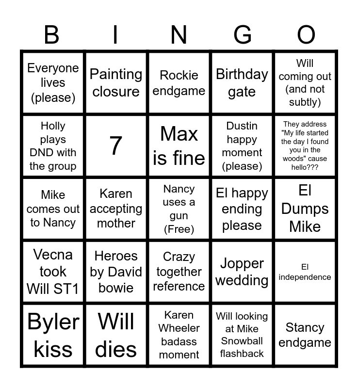 This bingo card has a free space and 64 words: Lovers-lake- gate, WLW MLM solidarity (Will and Robin), Ted says a homophobic one-liner again, El independence, Byler endgame, Letter-gate, Painting closure, Byler fighting, Max is fine, Jancy endgame, Crazy together reference, Will powers, El Dumps Mike, Will coming out (and not subtly), Steve gets over Nancy, Holly plays DND with the group, Karen accepting mother, Everyone lives (please), Erica Badass moment, Dustin happy moment (please), Heroes by David bowie, Vecna took Will ST1, Birthday gate, Mike Vecna'd, Will Vecna'd, Will has Lonnie memory, Small town boy, Mikes "Will voice", Church-gate, Robin clocks Byler, Murray clock Byler, Joyce clocks Byler, Jonathan clocks Byler, Mike confesses to Will, They address "My life started the day I found you in the woods" cause hello???, Byler kiss, Mileven, Will looking at Mike Snowball flashback, Blue and Yellow, 7, Mike comes out to Nancy, El happy ending please, Flicker-gate, Mr. Clarke comes in clutch, Will created UD Hawkins, Stancy endgame, Will dies, Steve dies, Jopper wedding, Lumax movie date, Jopper Enzo date, Will loses an eye, Karen Wheeler badass moment, Steve uses Jonathans bat again, Phone-gate, "What painting?", Rockie endgame, Dustin Vecna'd, El dies, Will vecna'd, Will kills vecna, Will in golden lighting, Ronance endgame and Stonathan endgame.