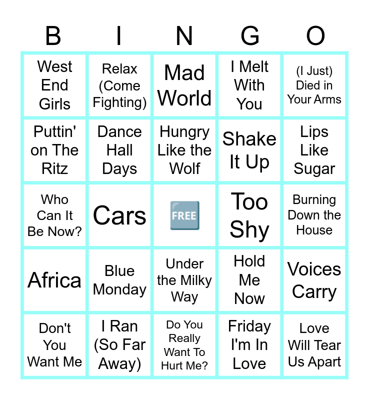 This bingo card has a free space and 24 words: Blue Monday, I Ran (So Far Away), Hungry Like the Wolf, Don't You Want Me, (I Just) Died in Your Arms, West End Girls, Puttin' on The Ritz, Relax (Come Fighting), Too Shy, Under the Milky Way, Shake It Up, Who Can It Be Now?, Hold Me Now, Voices Carry, Dance Hall Days, Friday I'm In Love, Burning Down the House, Mad World, Lips Like Sugar, Cars, Love Will Tear Us Apart, Africa, I Melt With You and Do You Really Want To Hurt Me?.