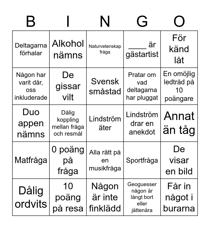 This bingo card has a free space and 24 words: 0 poäng på fråga, 10 poäng på resa, Svensk småstad, Dålig ordvits, För känd låt, Deltagarna förhalar, Någon har varit där, oss inkluderade, Alkohol nämns, Lindström drar en anekdot, Alla rätt på en musikfråga, Pratar om vad deltagarna har pluggat, Duo appen nämns, Sportfråga, De visar en bild, De gissar vilt, Geoguesser någon är långt bort eller jättenära, Annat än tåg, Naturvetenskap fråga, En omöjlig ledtråd på 10 poängare, Dålig koppling mellan fråga och resmål, Får in något i burarna, Matfråga, ____ är gästartist and Någon är inte finklädd.