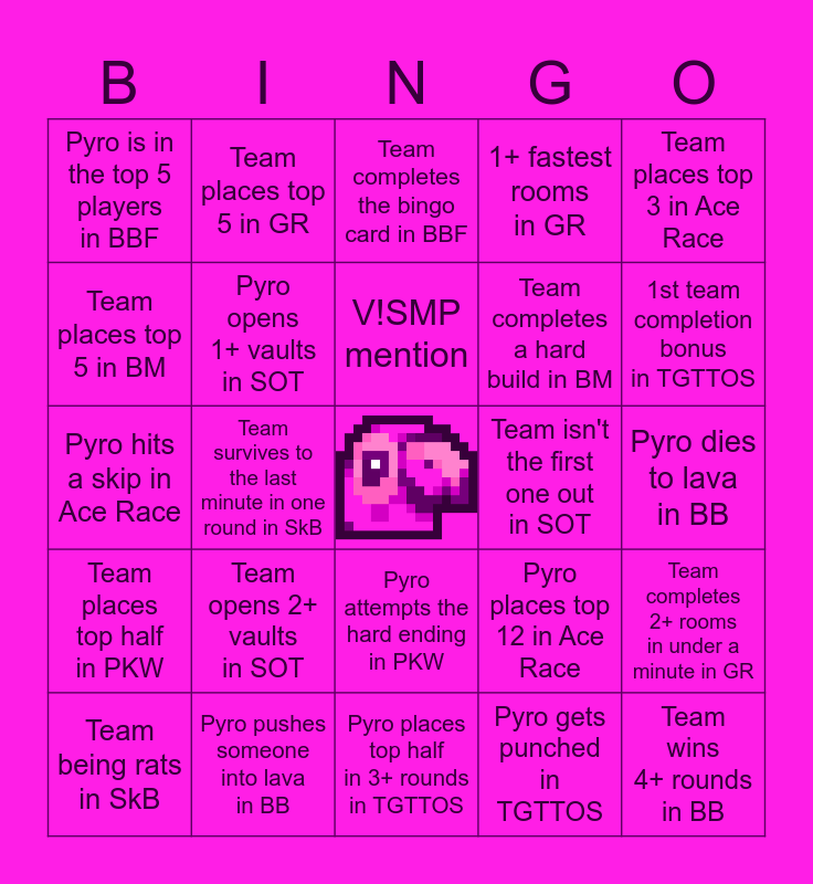 This bingo card has a free space and 29 words: Team being rats in SkB, Pyro gets 2+ kills in SkB, Team survives to the last minute in one round in SkB, Team places top 3 in BBF, Pyro is in the top 5 players in BBF, Team completes the bingo card in BBF, Pyro opens 1+ vaults in SOT, Team opens 2+ vaults in SOT, Team isn't the first one out in SOT, Pyro pushes someone into lava in BB, Pyro dies to lava in BB, Team wins 4+ rounds in BB, Pyro places top half in 3+ rounds in TGTTOS, Pyro gets punched in TGTTOS, 1st team completion bonus in TGTTOS, Pyro gets 23+ medals in PKW, Pyro attempts the hard ending in PKW, Team places top half in PKW, Team places top 3 in Ace Race, Pyro hits a skip in Ace Race, Pyro places top 12 in Ace Race, Team completes a gold build in BM, Team completes a hard build in BM, Team places top 5 in BM, 1+ fastest rooms in GR, Team places top 5 in GR, Team completes 2+ rooms in under a minute in GR, V!SMP mention and Pyro gets top 15 indiv.