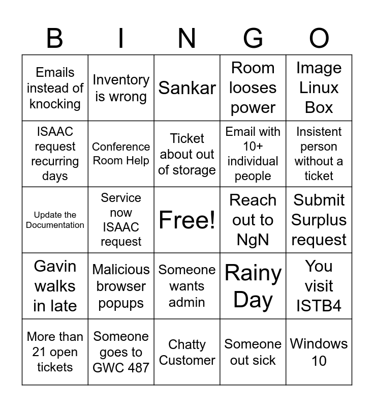 This bingo card has a free space and 44 words: Unmanaged Computer, Windows 10, Older than Windows 10, More than 21 open tickets, Close 5 tickets in 1 day, Someone out sick, Sankar, New ISAAC request with invalid key card, Image Linux Box, Someone goes to GWC 487, Room looses power, Reach out to NgN, Someone wants admin, Malicious browser popups, Image 4 computers in 1 day, Chatty Customer, 2 Key Requests in 1 day, Update the Documentation, Orange USB fails, Insistent person without a ticket, Inventory is wrong, Front Office sends redundant access request, Fire alarm, Emails instead of knocking, Just here to talk, Submit Surplus request, Customer Steals your chair, Make Surplus Request, Rainy Day, Gavin walks in late, Anyone has a new injury/medical issue, You visit ISTB4, Visit a building other than GWC/ERC/ISTB4, Shouldn't be on Windows 11, Service now ISAAC request, Phishing Email, VPN fixes Issue, Free Food, Ticket about out of storage, ISAAC request recurring days, Email with 10+ individual people, 25+ ISAAC Requests in 1 day, Conference Room Help and 3 Attempts to open the door.