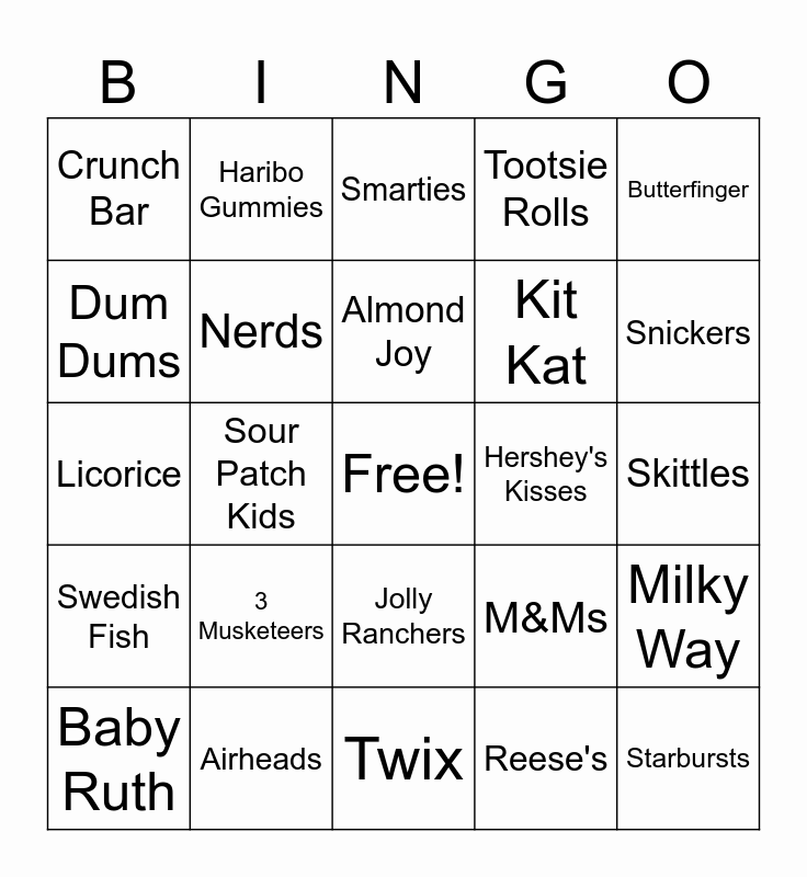 This bingo card has a free space and 24 words: 3 Musketeers, Airheads, Almond Joy, Baby Ruth, Butterfinger, Crunch Bar, Dum Dums, Haribo Gummies, Hershey's Kisses, Jolly Ranchers, Kit Kat, Licorice, M&Ms, Milky Way, Nerds, Reese's, Skittles, Smarties, Snickers, Sour Patch Kids, Starbursts, Swedish Fish, Tootsie Rolls and Twix.