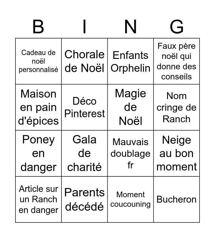 This bingo card has 16 words: Parents décédé, Neige au bon moment, Enfants Orphelin, Cadeau de noël personnalisé, Poney en danger, Chorale de Noël, Mauvais doublage fr, Moment coucouning, Maison en pain d'épices, Déco Pinterest, Article sur un Ranch en danger, Faux père noël qui donne des conseils, Gala de charité, Nom cringe de Ranch, Magie de Noël and Bucheron.