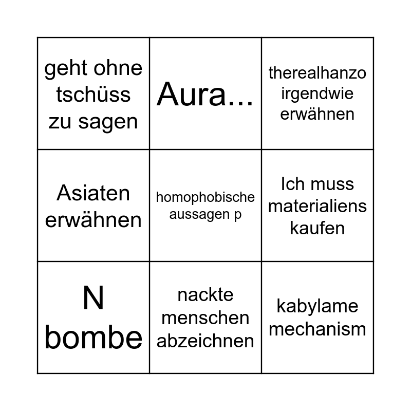 This bingo card has a free space and 8 words: Ich muss materialiens kaufen, therealhanzo irgendwie erwähnen, Aura..., N bombe, geht ohne tschüss zu sagen, kabylame mechanism, Asiaten erwähnen and nackte menschen abzeichnen.