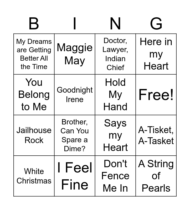 This bingo card has 18 words: Brother, Can You Spare a Dime?, A String of Pearls, Doctor, Lawyer, Indian Chief, My Dreams are Getting Better All the Time, Says my Heart, Here in my Heart, White Christmas, Maggie May, Free!, Jailhouse Rock, Don't Fence Me In, You Belong to Me, A-Tisket, A-Tasket, Goodnight Irene, Hold My Hand, Heartaches, I Feel Fine and The Object of My Affection.