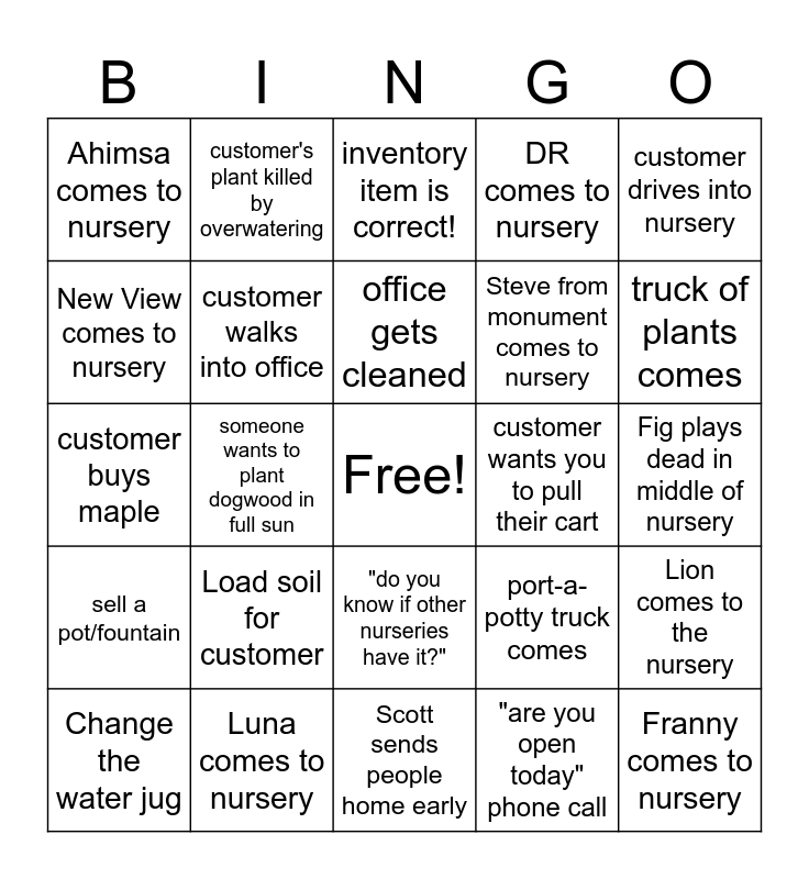 This bingo card has a free space and 32 words: "are you open today" phone call, tamale man comes back, someone wants to plant dogwood in full sun, retail customer wants wholesale, sell a pot/fountain, customer walks into office, customer drives into nursery, Lion comes to the nursery, customer's plant killed by overwatering, fitting big tree into clown car, office gets cleaned, inventory item is correct!, empty box of ice cream in cooler, "Is Christie here?", customer wants you to pull their cart, Deer ate my plant. can I get free replacement?, Change the water jug, customer buys maple, "do you know if other nurseries have it?", Load soil for customer, port-a-potty truck comes, Fig barks at children, Fig plays dead in middle of nursery, Luna comes to nursery, Franny comes to nursery, DR comes to nursery, Steve from monument comes to nursery, New View comes to nursery, Ahimsa comes to nursery, Scott sends people home early, ouch! stung by bee and truck of plants comes.