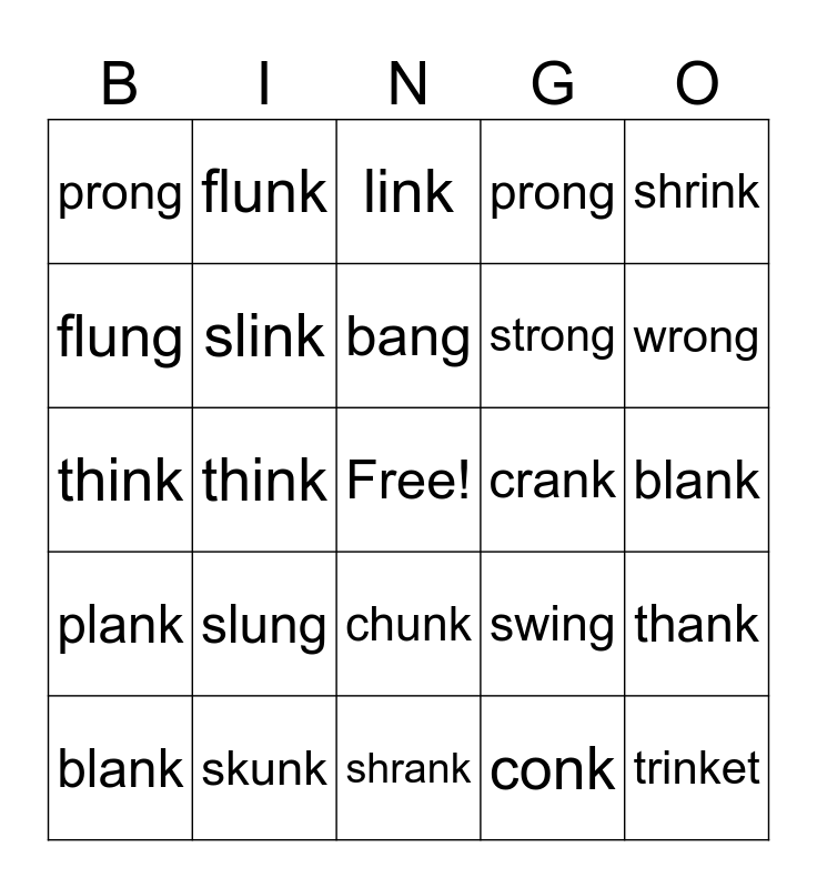 This bingo card has a free space and 24 words: slung, skunk, bang, blank, shrink, prong, flung, flunk, crank, chunk, strong, think, swing, thank, slink, conk, blank, link, wrong, think, trinket, plank, prong and shrank.