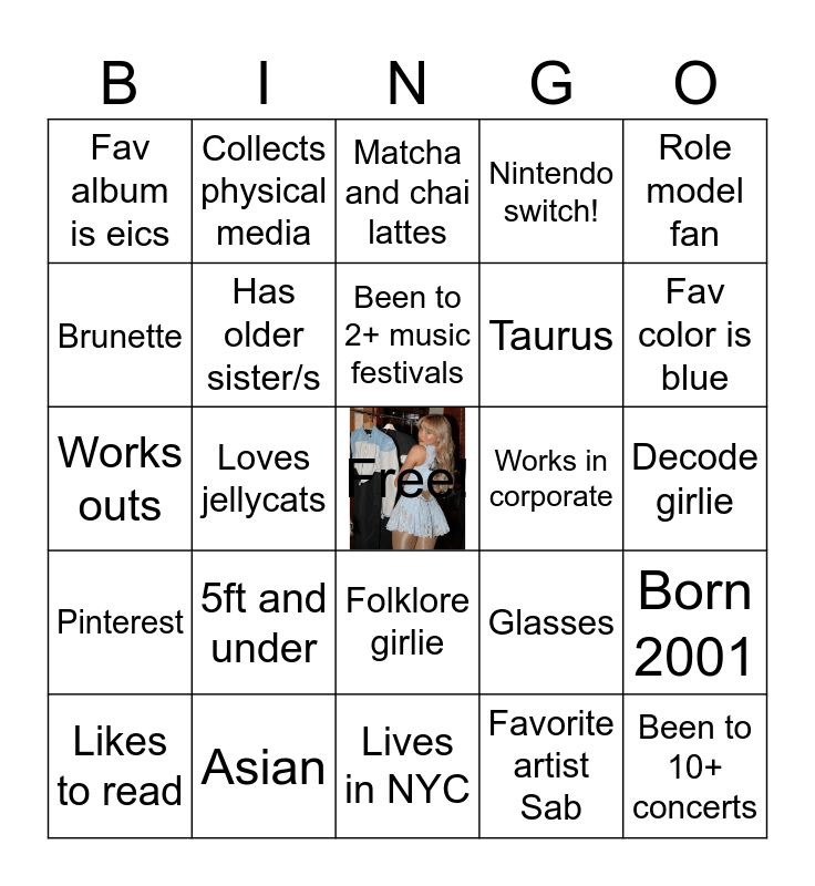 This bingo card has a free space and 24 words: 5ft and under, Asian, Been to 2+ music festivals, Likes to read, Role model fan, Fav album is eics, Brunette, Collects physical media, Works in corporate, Folklore girlie, Taurus, Works outs, Glasses, Born 2001, Has older sister/s, Favorite artist Sab, Decode girlie, Matcha and chai lattes, Fav color is blue, Loves jellycats, Been to 10+ concerts, Pinterest, Nintendo switch! and Lives in NYC.