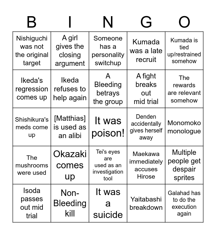 This bingo card has a free space and 24 words: Okazaki comes up, Non-Bleeding kill, A Bleeding betrays the group, Isoda passes out mid trial, Kumada is tied up/restrained somehow, Nishiguchi was not the original target, Ikeda's regression comes up, A girl gives the closing argument, Denden accidentally gives herself away, Tei's eyes are used as an investigation tool, A fight breaks out mid trial, Shishikura's meds come up, Maekawa immediately accuses Hirose, Multiple people get despair sprites, Ikeda refuses to help again, Yaitabashi breakdown, Monomoko monologue, Someone has a personality switchup, The rewards are relevant somehow, [Matthias] is used as an alibi, Galahad has to do the execution again, The mushrooms were used, Kumada was a late recruit and It was a suicide.