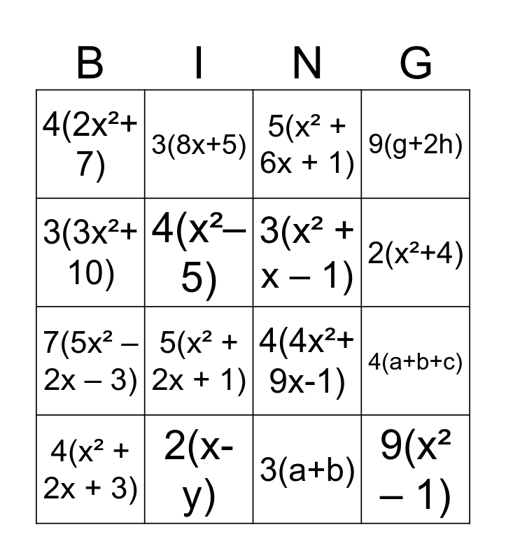 This bingo card has 24 words: 5(x²-5), 4(2x²+5), 2(x²+4), 2(x²+3x- 8), 3(3x²+ 10), 4(2x²+ 7), 4(x²–5), 3(8x+5), 2(x-y), 4(2x³+ 15x²-1), 7(5x² – 2x – 3), 4(4x²+ 9x-1), 3(x² + 7x + 12), 4(2x³+10x²+4), 3(x² + x – 1), 2(x² + 13x +4), 3(a+b), 5(x² + 6x + 1), 5(x² + 2x + 1), 4(a+b+c), 4(x² + 2x + 3), 9(x² – 1), 9(g+2h) and 8(x²-y).