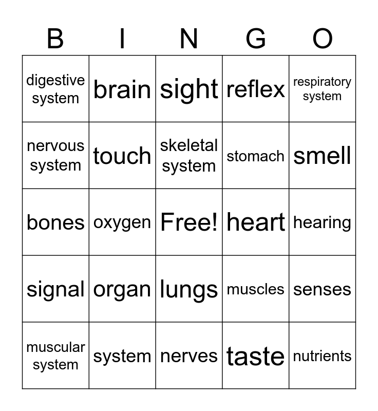 This bingo card has a free space and 24 words: organ, system, skeletal system, muscular system, respiratory system, digestive system, nervous system, brain, heart, lungs, stomach, bones, muscles, senses, touch, taste, hearing, sight, smell, oxygen, nutrients, signal, reflex and nerves.