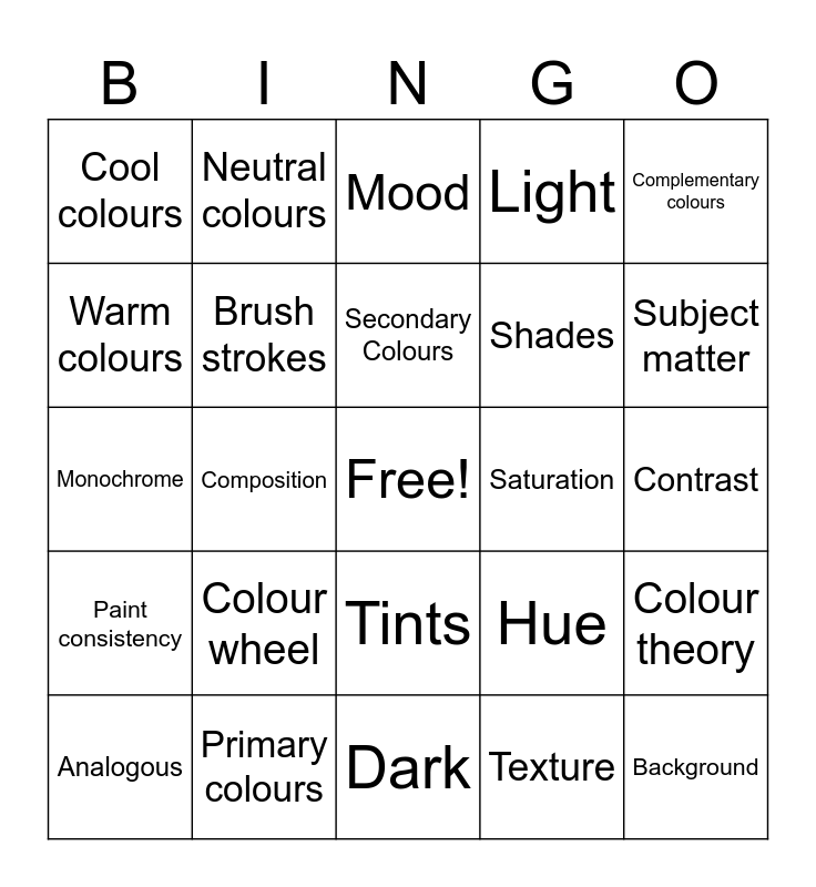 This bingo card has a free space and 24 words: Colour wheel, Primary colours, Secondary Colours, Analogous, Complementary colours, Cool colours, Warm colours, Neutral colours, Saturation, Tints, Shades, Monochrome, Hue, Colour theory, Brush strokes, Texture, Contrast, Mood, Subject matter, Composition, Background, Paint consistency, Light and Dark.