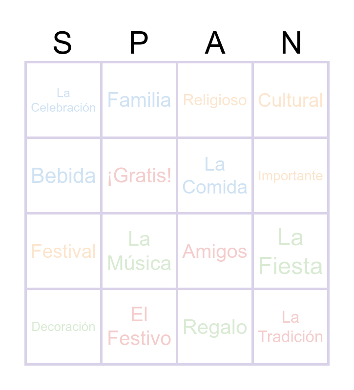 This bingo card has 16 words: El Festivo, La Fiesta, Religioso, La Celebración, Festival, Familia, Amigos, Regalo, Bebida, ¡Gratis!, Decoración, Cultural, La Música, Importante, La Comida and La Tradición.