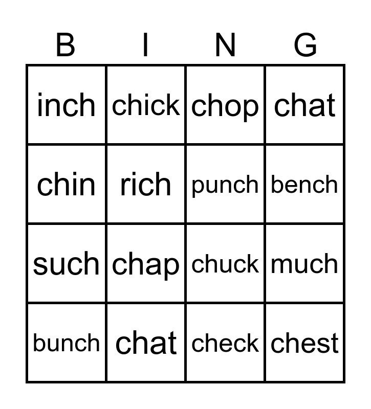 This bingo card has 20 words: much, chug, chop, lunch, bunch, chin, chat, inch, such, chick, chap, chuck, rich, chest, punch, chip, bench, chat, check and chum.