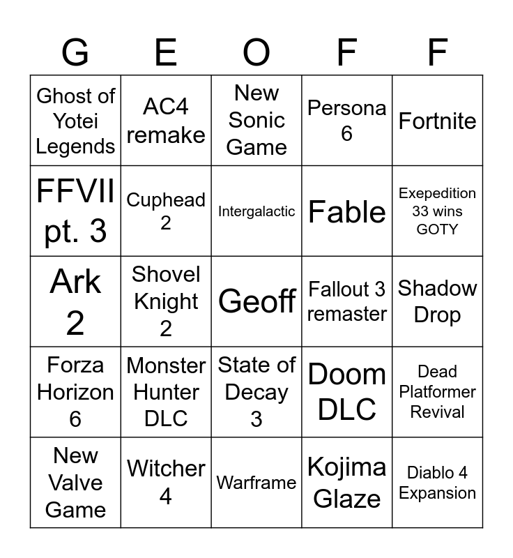 This bingo card has a free space and 24 words: Monster Hunter DLC, Witcher 4, Intergalactic, New Valve Game, Fortnite, Ghost of Yotei Legends, FFVII pt. 3, AC4 remake, Fallout 3 remaster, State of Decay 3, Fable, Ark 2, Doom DLC, Dead Platformer Revival, Cuphead 2, Kojima Glaze, Shadow Drop, New Sonic Game, Exepedition 33 wins GOTY, Shovel Knight 2, Diablo 4 Expansion, Forza Horizon 6, Persona 6 and Warframe.