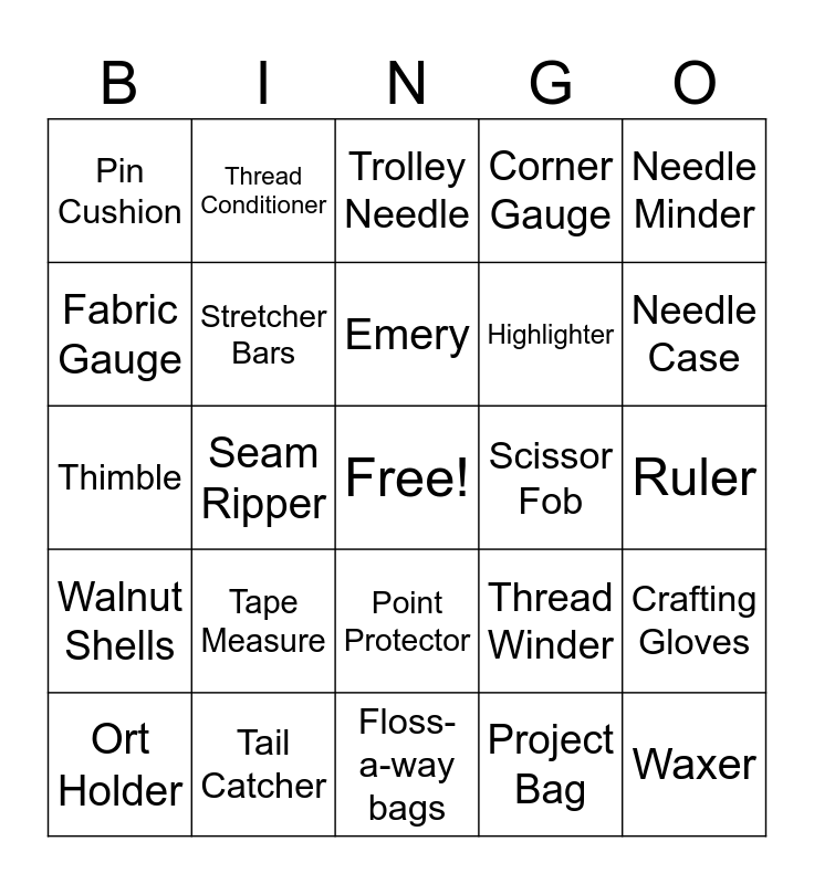 This bingo card has a free space and 44 words: Scissors, Waxer, Thread Keep, Ort Holder, Grime Guard, Project Bag, Trolley Needle, Needle, Needle Minder, Tail Catcher, Corner Gauge, Scissor Fob, Point Protector, Tape Measure, Q-Snap, Floss-a-way bags, Needle Threader, Thimble, Magnifier, Needle Case, Thread Conditioner, Thread Drop, Stitcher's Lotion, Pin Cushion, Snag Repair Tool, Ruler, Thread Cutter, Floss Bobbins, Thread Winder, Walnut Shells, Counting Pins, Crafting Gloves, Bead Tray, Laying Tool, Seam Ripper, Needle Tube, Pattern Holder, Hoop, Emery, Fabric Gauge, Highlighter, Bellpull, Stretcher Bars and Buttons.