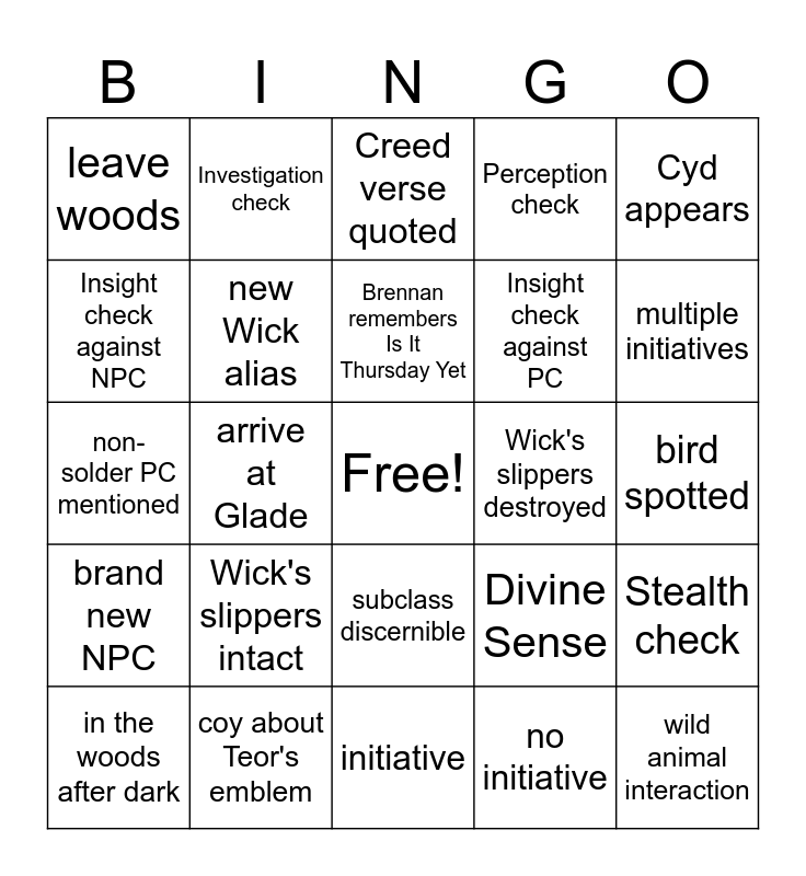 This bingo card has a free space and 29 words: in the woods after dark, cross into Timmony, arrive at Glade, got lost, leave woods, Creed verse quoted, new Wick alias, Wick's slippers intact, Wick's slippers destroyed, coy about Teor's emblem, bird spotted, wild animal interaction, initiative, no initiative, multiple initiatives, Wick subclass change, subclass discernible, brand new NPC, Cyd appears, non-solder PC mentioned, Divine Sense, History check, Insight check against PC, Insight check against NPC, Perception check, Investigation check, Stealth check, Brennan remembers Is It Thursday Yet and Brennan forgets Is It Thursday Yet.