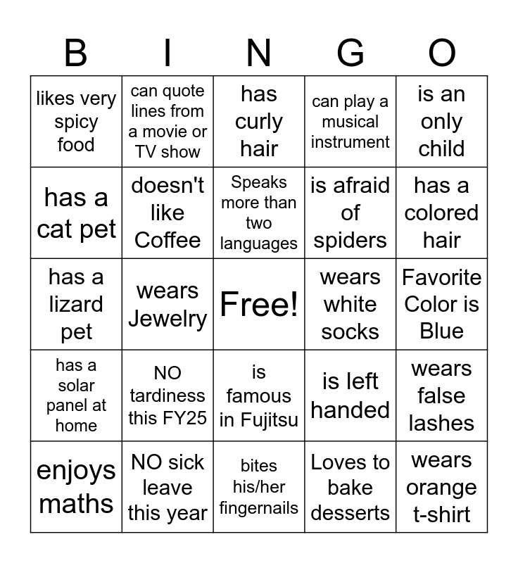 This bingo card has a free space and 55 words: hasn't had breakfast today, enjoys maths, won a contest, likes very spicy food, bites his/her fingernails, was born in January, doesn't like Coffee, doesn't like broccoli, is afraid of spiders, is afraid of cockroach, can play a musical instrument, has fainted in public, has had stiches, loves to swim, has multiple cars, has more than three siblings, is an only child, wears Jewelry, who graduated with honors, wears orange t-shirt, wears white socks, wears eye glasses, is left handed, has curly hair, Has run a marathon, Speaks more than two languages, Loves to bake desserts, Knows how to knit or crochet, Favorite Color is Blue, wears false lashes, wears nail art, wears jordan shoes, wears pink shirt, has a snake pet, has a cat pet, has a lizard pet, has a tattoo, has a solar panel at home, top ticket closer in the team, 2IC of the team, can quote lines from a movie or TV show, can play chess, has recently passed MS Certification, has the most passed MS Certification, NO tardiness this FY25, NO sick leave this year, Wears size 10 shoes, has a long straight hair, has a short hair (girl), has a colored hair, has a bald hair, wears black shirt, wears white shirt, is famous in Fujitsu and has multiple ear piercings.