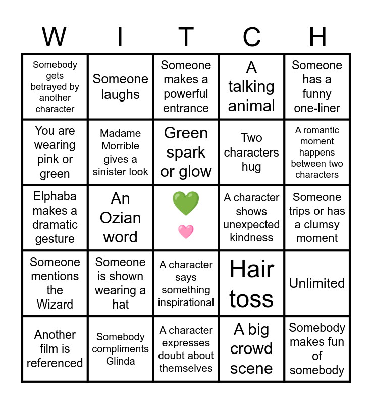 This bingo card has a free space and 34 words: A spell goes wrong, A big crowd scene, "There's no place like home.", Flying monkeys appear, Someone mentions the Wizard, Madame Morrible gives a sinister look, Someone has a funny one-liner, Another film is referenced, Someone laughs, Dramatic weather occurs, Green spark or glow, Someone makes a powerful entrance, A character sings off-key, A witch cackle, A character shows unexpected kindness, A romantic moment happens between two characters, Somebody compliments Glinda, Elphaba makes a dramatic gesture, Someone is shown wearing a hat, Hair toss, A character says something inspirational, Someone takes a drink of something, Somebody gets betrayed by another character, Someone trips or has a clumsy moment, A character expresses doubt about themselves, Somebody makes fun of somebody, A talking animal, Somebody makes a reference to something green, Two characters hug, You are wearing pink or green, Someone cries, An Ozian word, Unlimited and Glinda looks in a mirror.