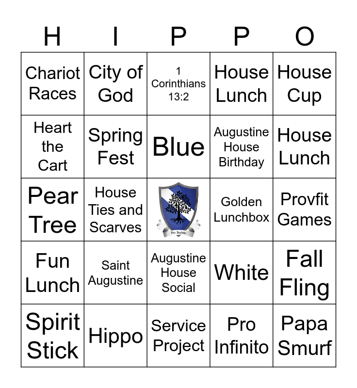 This bingo card has a free space and 24 words: Saint Augustine, Hippo, Blue, Spirit Stick, House Cup, Chariot Races, Heart the Cart, City of God, Golden Lunchbox, Augustine House Social, Augustine House Birthday, Pear Tree, White, Fall Fling, Spring Fest, Pro Infinito, Provfit Games, 1 Corinthians 13:2, House Lunch, House Ties and Scarves, Papa Smurf, Fun Lunch, House Lunch and Service Project.