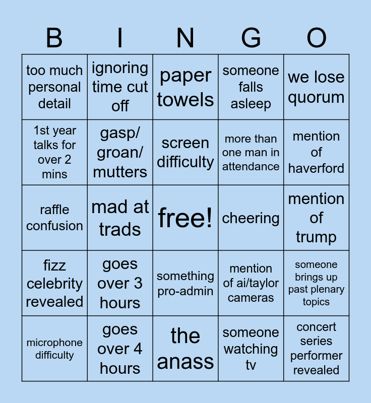 This bingo card has a free space and 24 words: goes over 3 hours, goes over 4 hours, screen difficulty, microphone difficulty, we lose quorum, too much personal detail, 1st year talks for over 2 mins, ignoring time cut off, cheering, something pro-admin, more than one man in attendance, raffle confusion, mention of ai/taylor cameras, someone brings up past plenary topics, gasp/ groan/ mutters, someone watching tv, mention of trump, paper towels, mention of haverford, mad at trads, concert series performer revealed, fizz celebrity revealed, someone falls asleep and the anass.