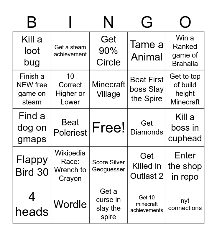 This bingo card has a free space and 24 words: Wikipedia Race: Wrench to Crayon, Wordle, Minecraft Village, 4 heads, Win a Ranked game of Brahalla, Kill a loot bug, Finish a NEW free game on steam, Get a steam achievement, Get Diamonds, Score Silver Geoguesser, Beat First boss Slay the Spire, Find a dog on gmaps, Get Killed in Outlast 2, Enter the shop in repo, 10 Correct Higher or Lower, Get 10 minecraft achievements, Kill a boss in cuphead, Get 90% Circle, Get to top of build height Minecraft, Beat Poleriest, nyt connections, Flappy Bird 30, Tame a Animal and Get a curse in slay the spire.