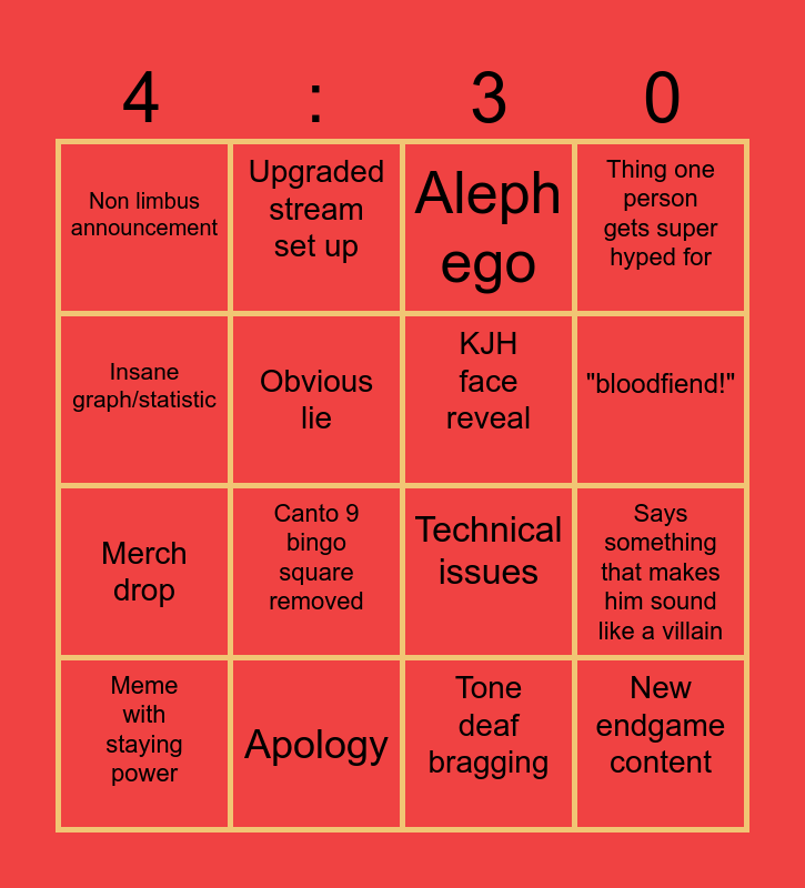 This bingo card has 16 words: Apology, Says something that makes him sound like a villain, Aleph ego, Non limbus announcement, Merch drop, Upgraded stream set up, Technical issues, Tone deaf bragging, Insane graph/statistic, Obvious lie, Meme with staying power, Thing one person gets super hyped for, Canto 9 bingo square removed, "bloodfiend!", KJH face reveal and New endgame content.