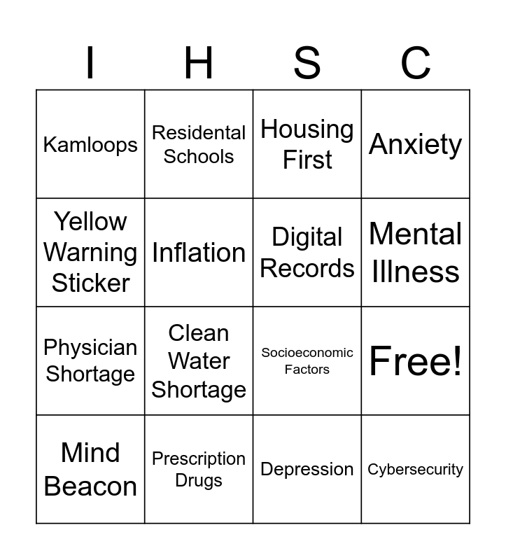 This bingo card has 20 words: Free!, Long Wait Times, Housing First, Encampment, Mind Beacon, Yellow Warning Sticker, Prescription Drugs, Kamloops, Physician Shortage, Residental Schools, Clean Water Shortage, Socioeconomic Factors, Inflation, Cybersecurity, Digital Records, Covid-19, Mental Illness, Anxiety, Depression and Burnout.