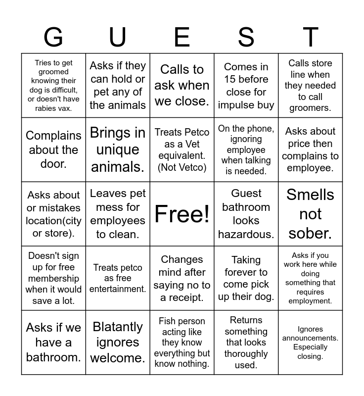This bingo card has a free space and 28 words: Asks if you work here while doing something that requires employment., Tries to put a fish in something too small. Ex: goldfish in fishbowl, On the phone, ignoring employee when talking is needed., Returns something that looks thoroughly used., Complains about the door., Calls to ask when we close., Asks if they can hold or pet any of the animals, Doesn't sign up for free membership when it would save a lot., Guest bathroom looks hazardous., Asks if we have a bathroom., Asks about or mistakes location(city or store)., Comes in 15 before close for impulse buy, Blatantly ignores welcome., Fish person acting like they know everything but know nothing., Asks about price then complains to employee., Unsupervised Children., Treats petco as free entertainment., Brings in unique animals., Treats Petco as a Vet equivalent. (Not Vetco), Changes mind after saying no to a receipt., Tries to get groomed knowing their dog is difficult, or doesn't have rabies vax., Compliments groomers then refuse to tip., Ignores announcements. Especially closing., Leaves pet mess for employees to clean., Smells not sober., Taking forever to come pick up their dog., Calls store line when they needed to call groomers. and Gets crickets at very busy times. (on accident).