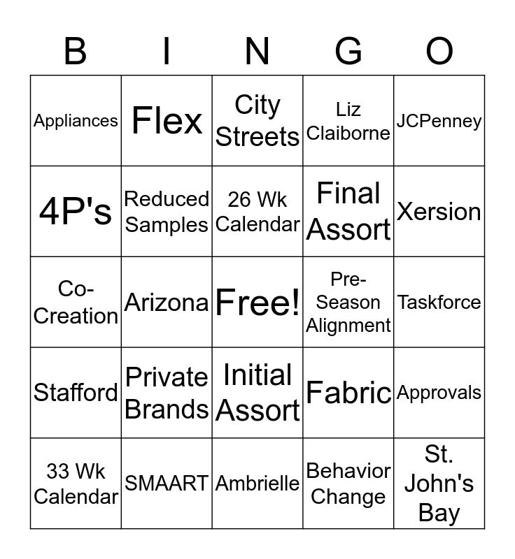 This bingo card has a free space and 24 words: Private Brands, SMAART, 26 Wk Calendar, 33 Wk Calendar, JCPenney, Appliances, 4P's, Flex, Pre- Season Alignment, Initial Assort, Final Assort, Co-Creation, Fabric, Approvals, Reduced Samples, Behavior Change, Taskforce, City Streets, Xersion, Arizona, St. John's Bay, Stafford, Liz Claiborne and Ambrielle.