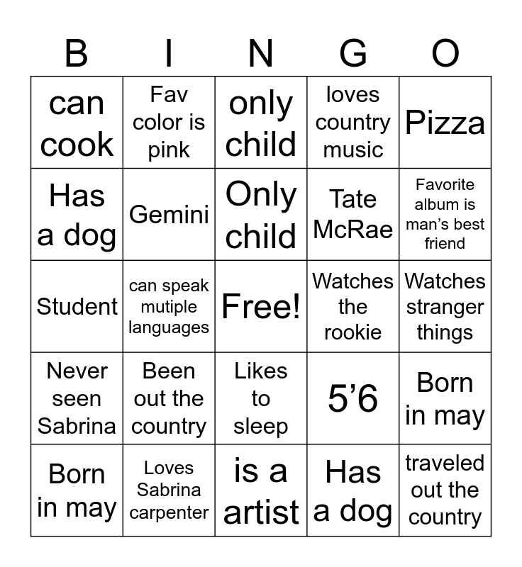 This bingo card has a free space and 24 words: Been out the country, Loves Sabrina carpenter, Only child, Born in may, Pizza, can cook, Has a dog, Fav color is pink, Watches the rookie, Likes to sleep, Tate McRae, Student, 5’6, Born in may, Gemini, Has a dog, Watches stranger things, only child, Favorite album is man’s best friend, can speak mutiple languages, traveled out the country, Never seen Sabrina, loves country music and is a artist.