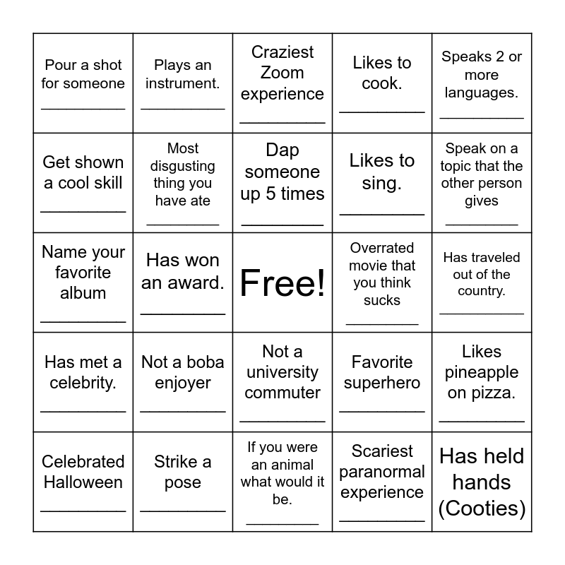 This bingo card has a free space and 64 words: Find at least 2 people to do a skit, Is a STEM major _______, Is older than you (Unc Status) _______, Likes pineapple on pizza. _________, Loves the beach. _________, Plays an outdoor sport. ________, Plays an instrument. __________, Has a birthday in the summer. ___________, Dap someone up 5 times ________, Is the oldest child. _________, Not a university commuter _________, Favorite restaurant. _______, Has traveled out of the country. ___________, Speaks 2 or more languages. __________, Is an artist. ______, Get shown a cool skill _________, Has won an award. ________, Pour a shot for someone __________, How did you meet the host? _________, Likes to sing. ________, Not a boba enjoyer _________, Has met a celebrity. _________, Likes to cook. _________, Is a university graduate ________, Favorite music artist _________, Show someone a meme they haven't seen _________, Weirdest thing they saw _________, 2nd Favorite Color _________, Is the younger child _________, Favorite car _________, Owns a pet _________, Has a collection and what kind _________, Has an occupation _________, Is a younger than you (Jit status) _________, Speak on a topic that the other person gives _________, Celebrated Halloween _________, Worst drunk moment you saw or experienced _________, Scariest paranormal experience _________, Favorite clothing place you shop at _________, Most disgusting thing you have ate _________, Name your favorite album _________, Overrated movie that you think sucks _________, Most overrated place to go to _________, Favorite game _________, What's your favorite childhood memory, Has held hands (Cooties), Strike a pose _________, Take a selfie with someone _________, Favorite superhero _________, Favorite Candy _________, Childhood nickname _________, Staring Contest! _________, If you were an animal what would it be. _________, Find a person to give you an impression to do _________, Craziest conversation you had this month _________, Best or worst Christmas gift _________, Craziest Zoom experience _________, Favorite childhood toy _________, Likes yaoi or yuri _________, Has had surgery _________, Craziest wildlife encounter _________, Favorite culture experience _________, Best hangout spot _________ and Craziest campus moment experienced _________.