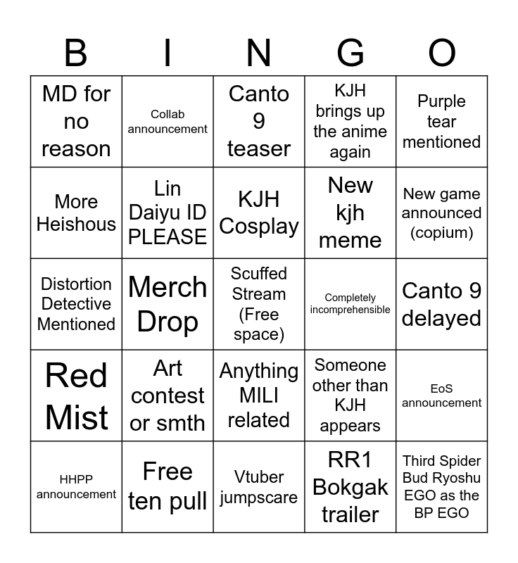 This bingo card has a free space and 24 words: Art contest or smth, Free ten pull, KJH Cosplay, HHPP announcement, Purple tear mentioned, MD for no reason, More Heishous, Collab announcement, Completely incomprehensible, Anything MILI related, New kjh meme, Distortion Detective Mentioned, Someone other than KJH appears, EoS announcement, Lin Daiyu ID PLEASE, RR1 Bokgak trailer, Canto 9 delayed, Canto 9 teaser, New game announced (copium), Merch Drop, Third Spider Bud Ryoshu EGO as the BP EGO, Red Mist, KJH brings up the anime again and Vtuber jumpscare.