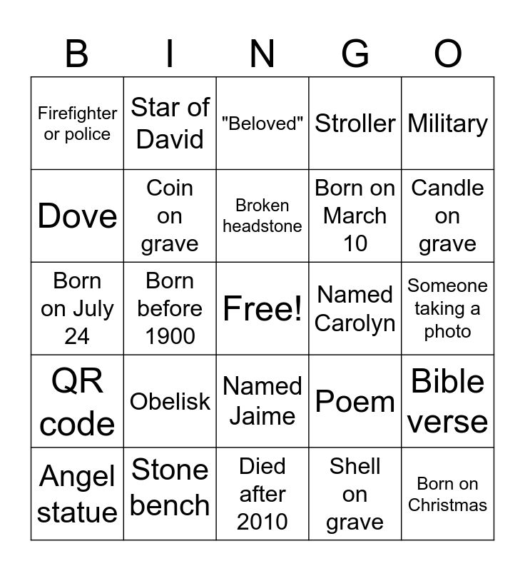 This bingo card has a free space and 24 words: Obelisk, Stone bench, Broken headstone, Angel statue, Military, Firefighter or police, Dove, Star of David, Named Carolyn, Named Jaime, Born on March 10, Born on July 24, Poem, Bible verse, Coin on grave, Shell on grave, Someone taking a photo, "Beloved", Candle on grave, Born before 1900, Born on Christmas, QR code, Stroller and Died after 2010.