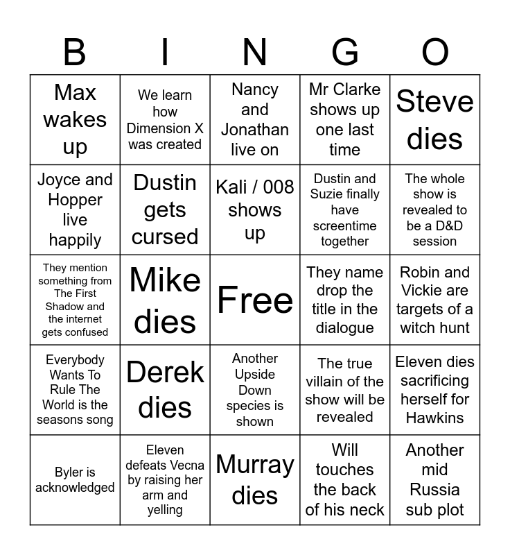 This bingo card has a free space and 24 words: Derek dies, Eleven defeats Vecna by raising her arm and yelling, Kali / 008 shows up, Byler is acknowledged, Steve dies, Max wakes up, Joyce and Hopper live happily, We learn how Dimension X was created, They name drop the title in the dialogue, Another Upside Down species is shown, Dustin and Suzie finally have screentime together, They mention something from The First Shadow and the internet gets confused, The true villain of the show will be revealed, Eleven dies sacrificing herself for Hawkins, Dustin gets cursed, Will touches the back of his neck, Robin and Vickie are targets of a witch hunt, Nancy and Jonathan live on, The whole show is revealed to be a D&D session, Mike dies, Another mid Russia sub plot, Everybody Wants To Rule The World is the seasons song, Mr Clarke shows up one last time and Murray dies.