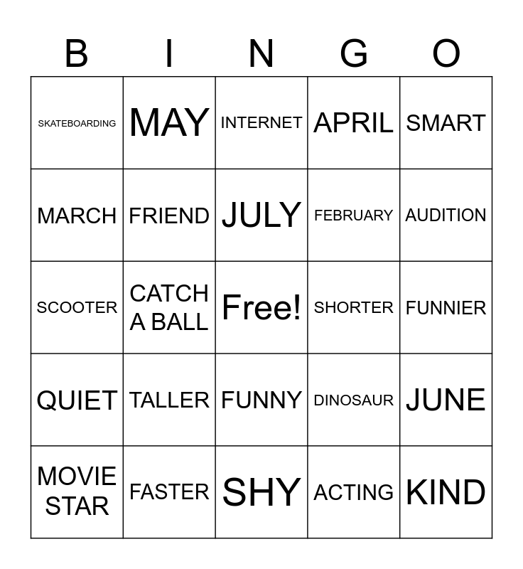 This bingo card has a free space and 29 words: MOVIE STAR, MOVIE STUDIO, CATCH A BALL, SINGING, SKATEBOARDING, INTERNET, FRIEND, TALLER, SHORTER, FASTER, FUNNIER, KIND, SHY, ACTING, AUDITION, SHY, FUNNY, QUIET, SMART, SCOOTER, DINOSAUR, JANUARY, FEBRUARY, MARCH, APRIL, MAY, JUNE, JULY and AUGUST.