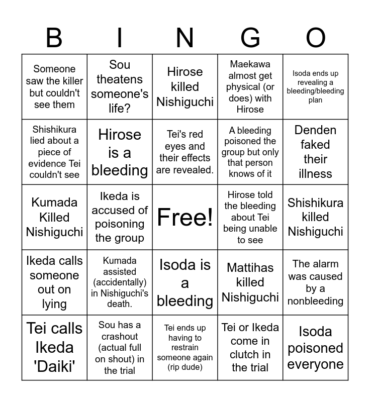 This bingo card has a free space and 24 words: Kumada assisted (accidentally) in Nishiguchi's death., Sou has a crashout (actual full on shout) in the trial, Tei's red eyes and their effects are revealed., Tei calls Ikeda 'Daiki', Isoda ends up revealing a bleeding/bleeding plan, Someone saw the killer but couldn't see them, Shishikura lied about a piece of evidence Tei couldn't see, Sou theatens someone's life?, Hirose told the bleeding about Tei being unable to see, Isoda is a bleeding, A bleeding poisoned the group but only that person knows of it, Kumada Killed Nishiguchi, Mattihas killed Nishiguchi, The alarm was caused by a nonbleeding, Hirose is a bleeding, Tei or Ikeda come in clutch in the trial, Shishikura killed Nishiguchi, Hirose killed Nishiguchi, Denden faked their illness, Ikeda is accused of poisoning the group, Isoda poisoned everyone, Ikeda calls someone out on lying, Maekawa almost get physical (or does) with Hirose and Tei ends up having to restrain someone again (rip dude).