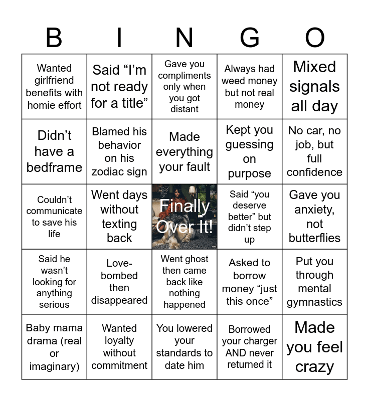 This bingo card has a free space and 72 words: Treated me like a situationship, Said “I’m not ready for a title”, Went days without texting back, Never paid for a date, CashApp request at midnight, Promised he’d change (and didn’t), Always had weed money but not real money, Needed rides everywhere, Kept you guessing on purpose, “He not even your man” behavior, Baby mama drama (real or imaginary), Gaslit you into apologizing, No car, no job, but full confidence, Wanted girlfriend benefits with homie effort, Came back the moment you moved on, Couldn’t communicate to save his life, Asked to borrow money “just this once”, Mixed signals all day, Low effort + high expectations, Gave you anxiety, not butterflies, Love-bombed then disappeared, Made you feel crazy, Put you through mental gymnastics, Bare minimum king, Treated me like a sometimes, Said “I’m just vibing right now”, Only called when he was bored, Asked for a “ride real quick”, Couldn’t plan a date to save his life, Made you bring the energy every time, Wanted loyalty without commitment, Didn’t post you but posted the boys, Always “going through something”, Had the audacity but not the stability, Borrowed your charger AND never returned it, Didn’t know how to apologize, Told half-truths like it was a hobby, Thought being “goofy” was a personality, Didn’t have a bedframe, Called you “crazy” for having boundaries, Went ghost then came back like nothing happened, Matched your vibe only when it benefited him, Acted single in group chats, Believed effort = texting you at 2 AM, Too friendly with his “female best friend”, Said he wasn’t looking for anything serious, Loved-bombed for 3 days then vanished, Couldn’t remember simple things about you, Only communicated through memes, Had “potential” he never unlocked, Made you do all the emotional labor, Didn’t open your message but watched your story, Asked you what you bring to the table, Said “you deserve better” but didn’t step up, Always “in between jobs”, Used your car but never filled the tank, Gave you compliments only when you got distant, Made everything your fault, Brought nothing but stress and vibes, Played victim every time you confronted him, Was inconsistent on purpose, Made promises during pillow talk only, Had the confidence of a man who shouldn’t, You lowered your standards to date him, Thought therapy was “too much”, Gave mixed signals like it was his love language, Blamed his behavior on his zodiac sign, Asked you what YOU were doing after ignoring you all day, Posted about healing but still toxic, Had “rapper dreams” with no songs out, Kept saying “you overthinking” and Didn’t know the difference between affection and attention.