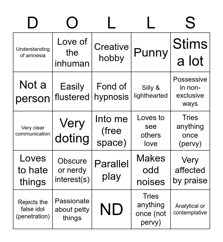 This bingo card has a free space and 24 words: Obscure or nerdy interest(s), Passionate about petty things, Fond of hypnosis, Rejects the false idol (penetration), Stims a lot, Understanding of amnesia, Not a person, Love of the inhuman, Loves to see others love, Parallel play, Silly & lighthearted, Very clear communication, Makes odd noises, Very affected by praise, Easily flustered, Tries anything once (not pervy), Tries anything once (pervy), Creative hobby, Possessive in non-exclusive ways, Very doting, Analytical or contemplative, Loves to hate things, Punny and ND.